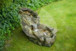 De boomstammen en stenen zijn prachtig nagemaakt uit polyresin. Dit mengsel van kunsthars met gemalen steen geeft een oersterk materiaal waardoor uw waterornament het gehele jaar door buiten kan blijven staan. Enkel in de vorstperiode dient u het waterreservoir te legen. Het waterornament wordt compleet geleverd, na installatie dient u enkel het reservoir van water te voorzien en u kunt direct genieten van het kabbelende water.