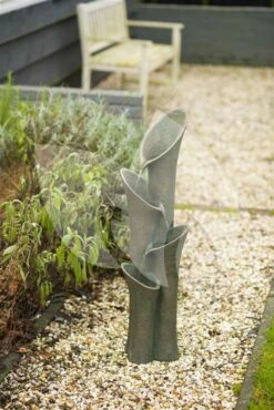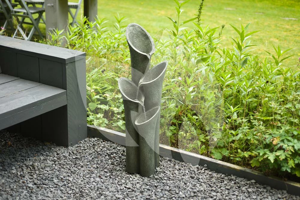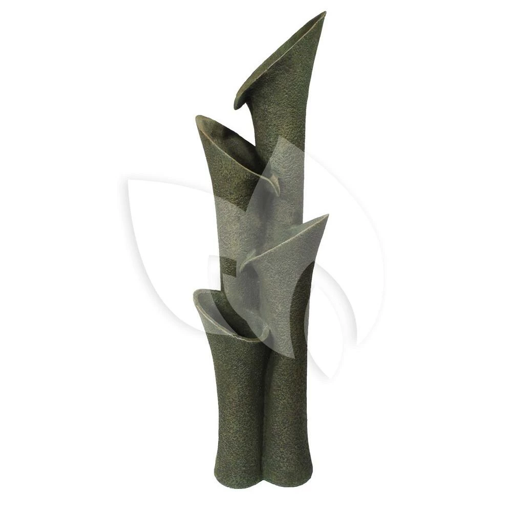 Dit sierlijk moderne waterornament bestaat uit trompetten in verschillende hoogtes waarin het water stroomt van het ene naar de andere trompet. Het ornament heeft een luxueuze bronzen look, maar is volledig van polyresin vervaardigd. Het waterornament heeft een inpandig waterreservoir en is daardoor te gebruiken als vrijstaand waterornament; zelfs uw balkon kunt u inrichten met dit waterornament.