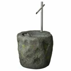 Dit bijzondere waterornament bestaat uit een gewaagde combinatie van modern versus rustiek. De polyresin bak is zo vormgegeven dat het uit een eeuwenoude kei lijkt te zijn gebeiteld. De toevoeging van een RVS -fontein geeft het waterornament vervolgens een speels karakter. Dit waterornament is de eyecatcher van een sfeervol gedecoreerd hoekje op uw terras. Door hem in een hoek van de tuin te plaatsen kun je de hoeken van een tuin mooi doorbreken zodat de tuin ook nog eens een stukje groter lijkt. Dit kun je bijvoorbeeld ook nog doen met een mooie bloempot of planten bak.