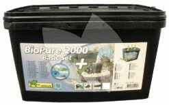 BioPure 2000 Basic-Set is een biologisch-mechanisch onderwaterfilter voor een optimale filterwerking, deze is geschikt voor vijver tot 2000 liter inhoud. De onderwaterfilter set is uitgerust met een vijverpomp (Elimax 1000) die het water aanzuigt door de geperforeerde deksel van het filter. Het water stroomt door het filtermateriaal terug de vijver in, via de sproeikop van de pomp of via een gekoppelde beekloop.
