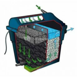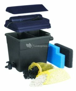 - Vulling kamer 1: Filtermat zwart 10 ppi, biokernen en filterbodem