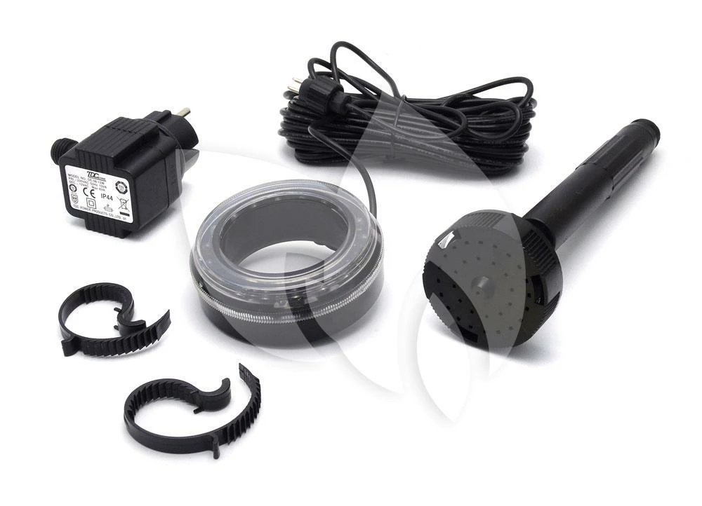 De Jet Vulcano is een sproeikop voorzien van diverse ledlampjes. De 18 verschillende ledlampjes hebben ieder een vermogen van 0,2 Watt. De lampjes voldoen aan de Europese veiligheidsrichtlijnen, zijn energiezuinig en zeer duurzaam. De telescopische verlengbuis kunt u in hoogte verstellen van 18 tot 30 cm. De sproeikop heeft een aansluiting van 1/2” buitenschroefdraad en wordt geleverd inclusief veiligheidstransformator en een kabel met een lengte van 10 meter. Voor de sproeikop wordt de fonteinpomp Elimax 500-2500 l/h van Ubbink aangeraden, deze is niet inbegrepen.