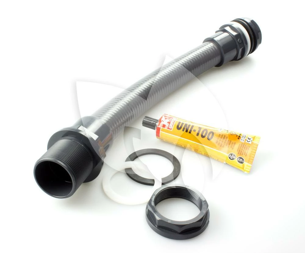 Gebruik het vijver verbindingsset om vijvers op een veilige manier te verbinden. Boor een gat van 60mm in een vlak gedeelte van de vijver om de doorvoer waterdicht te kunnen plaatsen.
