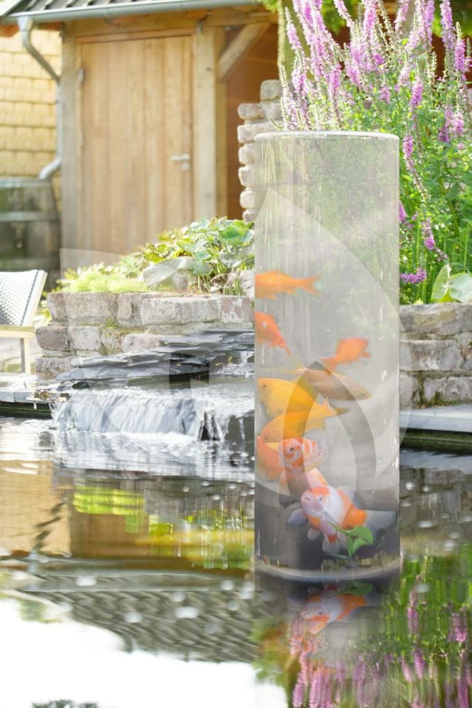 Bij het doorbreken van de eerste zonnestralen zal het water in de toren warmer worden dan het water in de rest van de vijver, door de warmte worden de vissen aangetrokken en zwemmen zij de toren in. Door het materiaal van de toren lijken de vissen optisch groter, optimaal genieten van de vissen dus!