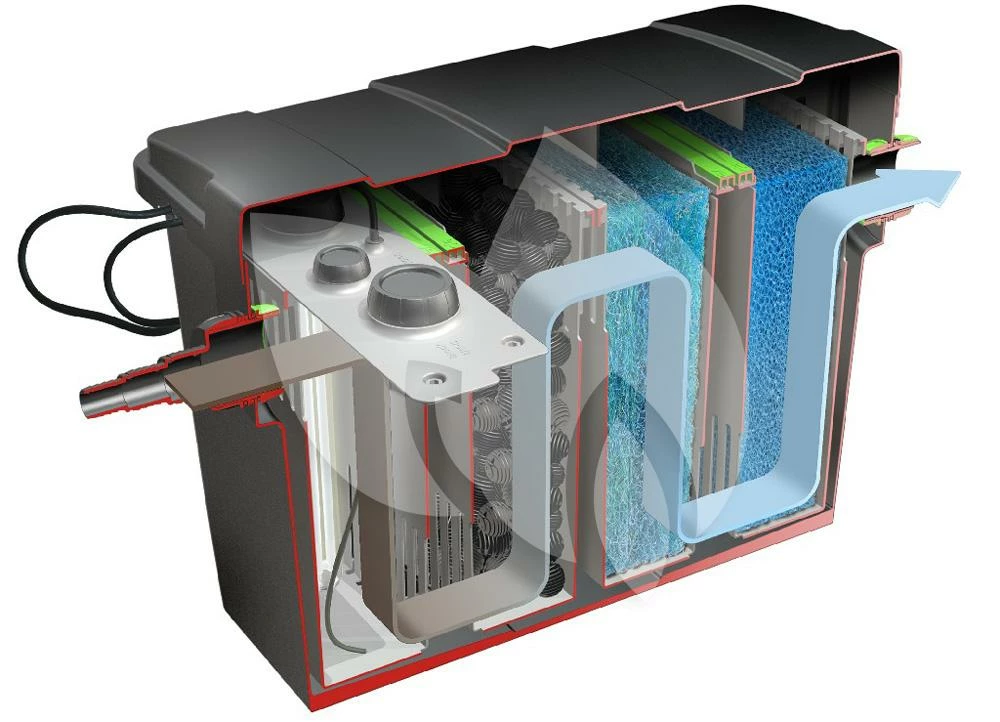 De Giant Biofill XL bestaat uit een grote en ruime filterunit met een inhoud van circa 250 liter met 4 cassettes. De cassettes zijn allemaal uitneembaar waardoor u ze gemakkelijk schoon kunt spoelen. De eerste cassette bestaat uit de ingebouwde 18 Watt UV-C unit voor kristalhelder water en bestrijding tegen ziektekiemen en zweefalgen en een tablethouder voor de bijgeleverde Mineral Filterstart tabletten. Deze tabletten verhogen de hardheid en bevorderen een evenwichtige mineralenbelans. Daarnaast is er de mogelijkheid om een luchtpomp (Silenta 300) aan te sluiten of een verwarming (Pond Heater) te installeren. De tweede cassette is gevuld met bioballen, wat zorgt voor een goede vuilfiltering, waterdoorstroming en aanhechting van micro-organismen. De derde cassette bestaat uit een Japanse grove mat, welke de fijne stofdeeltjes uit het water filter. Als laatste de vierde cassette, deze is voorzien van een fijne Japanse mat om het laatste vuil op te vangen.