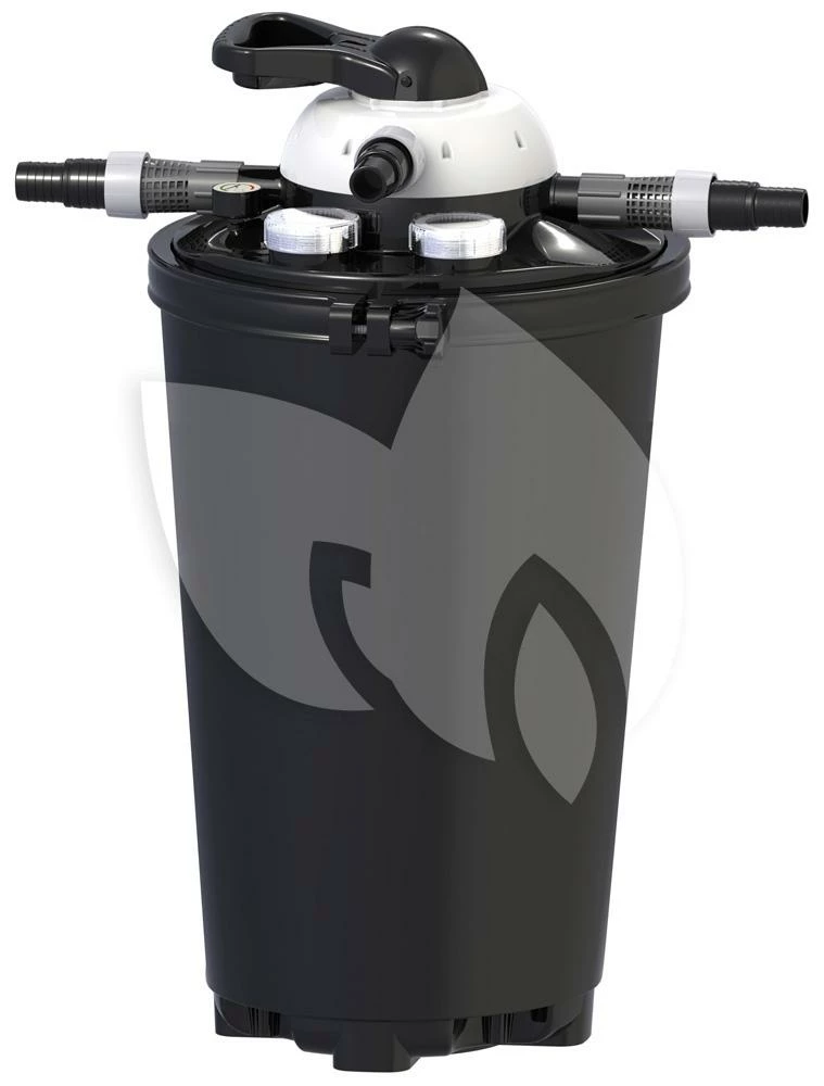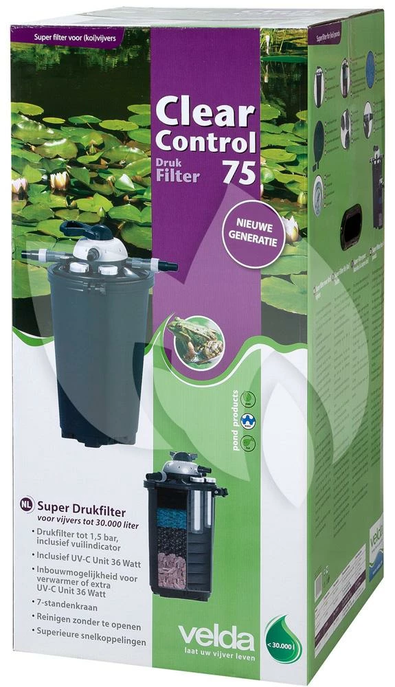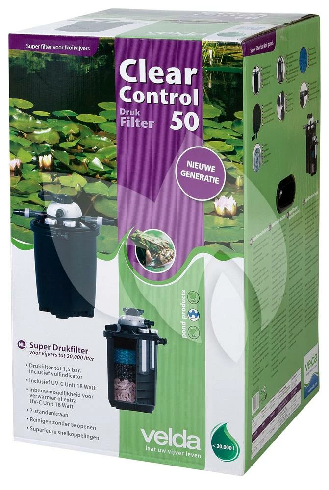 Deze zeer complete biologische drukfilter filtert het water weer kristalhelder en kan het water wel opvoeren tot een hoogte van 4 meter. Aangezien het filter bestand is tegen hoge druk is hij ook uitermate geschikt om te gebruiken voor een waterval. Doordat het drukfilter is voorzien van een UV-C lamp worden groene zweefalgen en andere ziektekiemen door de UV-straling gedood. Als één UV-C lamp onvoldoende is voor de doding van zweefalgen dan heeft u altijd de mogelijkheid om een tweede UV-C lamp te installeren in het filter. Het drukfilter heeft 7 verschillende standen en zijn doormiddel van de gemakkelijk te bedienen 7-standenkraan eenvoudig in te stellen. De 7 standen zijn als volgt: filterspoelstand, leegloopstand, filtratiestand, blokstand, medicijnenstand en winterstand. De standen worden uitgebreid toegelicht in de bijgevoegde gebruiksaanwijzing. De Clear Control is gemakkelijk aan te sluiten en er zijn drie typen drukfilters beschikbaar.